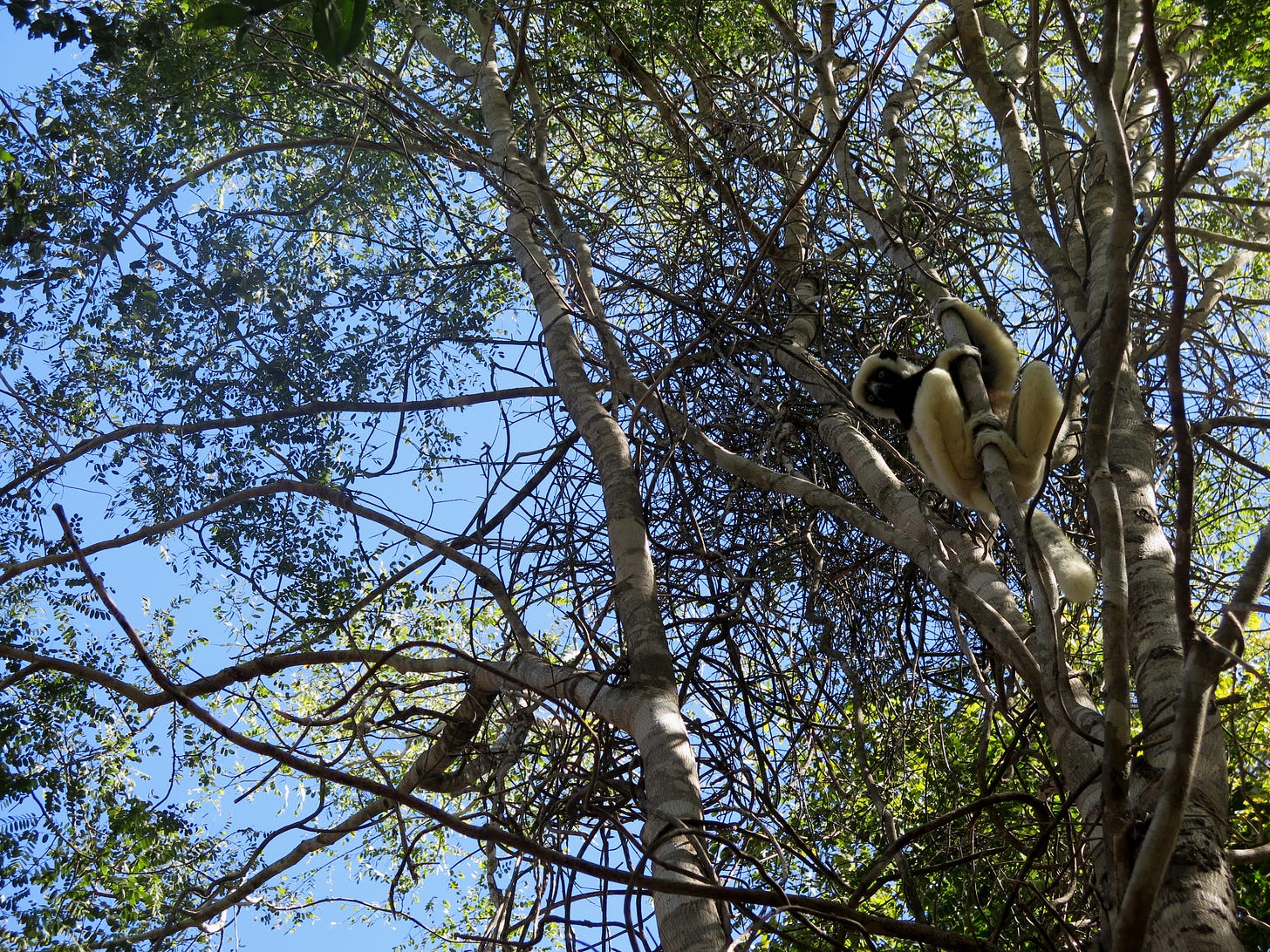 But my favourite encounter of all was with a family of sifakas—the fantastic leaping lemurs that spring from tree to tree—making their way through our camp one afternoon, pausing to look down at these funny long-lost cousins who had turned up in their patch of forest.